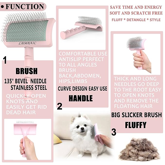 - 【Easier For Groomer To Untie The Tangle Spend Less Time Combing.】- Our Slicker brush is good to get in touch with the root of your pet's hair.Remove underlayer fluff to prevent tangles.The dog slicker brush has soft needle,buffer force,make brush have resilience,effectively avoid injury to the skin.Light weight save the time and energy of grooming and brushing.Great use for Fluff,detangle and style with one tool.Also good use for daily gently brush away loose hair,undercoat,mats,and tangles.