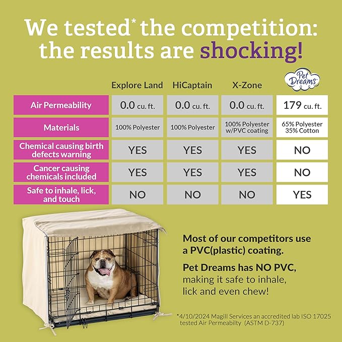 - ππ«ππππ‘πππ₯π ππ¨π ππ«πππ ππ¨π―ππ«: Clinically Tested and Rated Best Air Flow. Most Dog Crate Covers are polyester coated with toxic PVC that are Not Breathable despite false claims. Our Covers were tested by a certified government laboratory and had the highest air flow score. They are made for Indoor use and are never coated for maximum ventilation. WARNING: Never completely close your Crate Cover as it blocks airflow and creates a low oxygen environment which is not healthy for your dog
