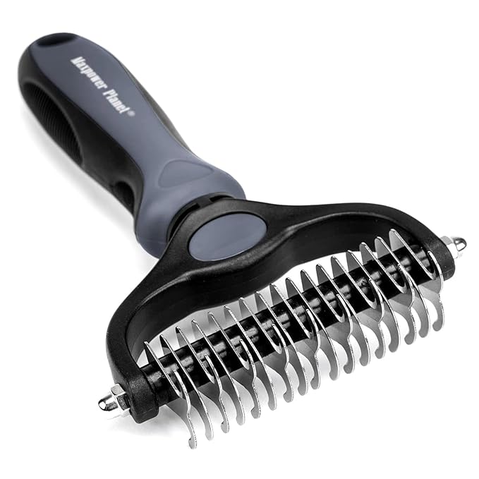 - DUAL-SIDED DESIGN: Our grooming brush is perfect for dematting and deshedding your pet's coat! With a dual-sided design, use the 9-teeth side to tackle stubborn mats and tangles and the 17-teeth side to thin out and deshed your pet's fur.