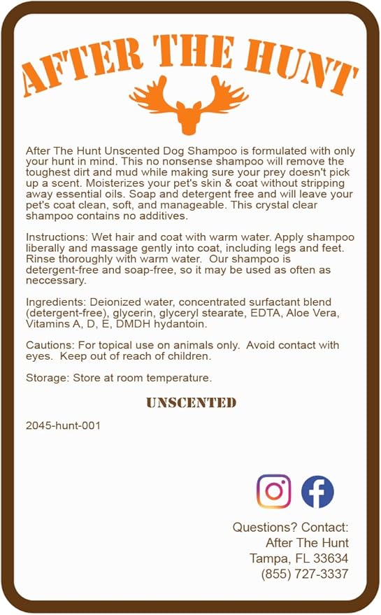 - After The Hunt Unscented Dog Shampoo 8 oz - Will clean your dog and make sure your prey doesn't pick up a scent. Moisturizes your pet's skin without stripping away essential oils. Soap and detergent free formula will leave your dog's coat clean, soft, and manageable.