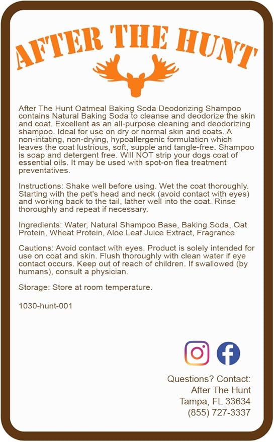 - After The Hunt Oatmeal Baking Soda Deodorizing Dog Shampoo 8 oz - With ingredients of baking soda, gentle oat, wheat proteins, and aloe leaf juice, this shampoo serves as the perfect all-purpose cleansing, deodorizing and conditioning shampoo when returning from the hunt.