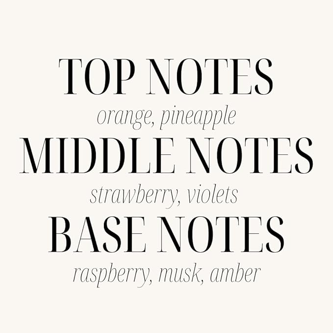 - Top notes: orange and pineapple, Middle notes: strawberry and violet, Base notes: raspberry, musk and amber