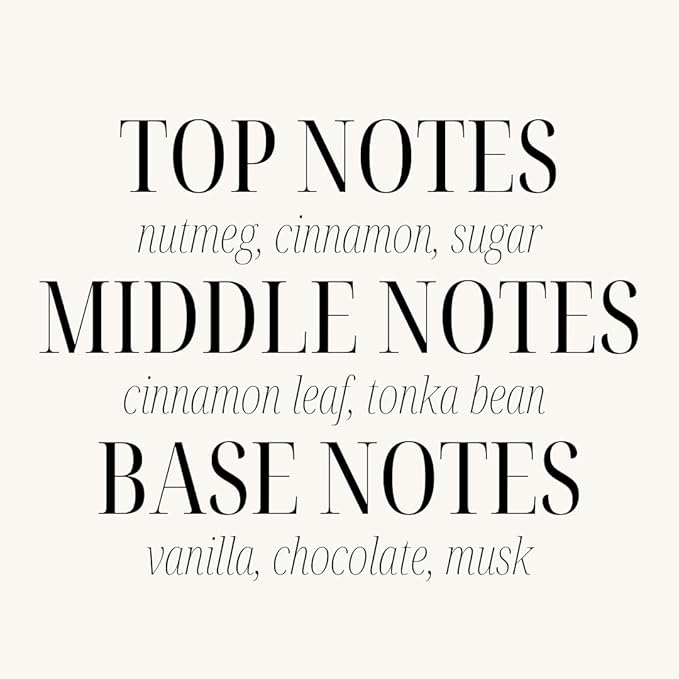- Top notes: nutmeg, cinnamon and sugar, Middle notes: cinnamon leaf and Tonka bean, Base notes: vanilla, chocolate and musk