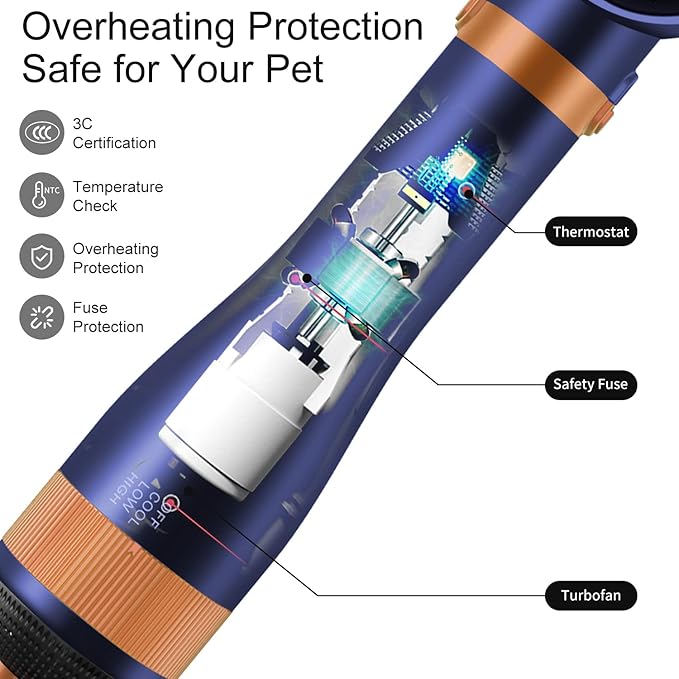 - 【Multifunctional Dog Hair Dryer Brush with Comfortable Grooming】 A brilliant combination of hair dryer,comb brush,massage. it allows you to achieve get a healthy looking coat efficiently without a trip to the groomers, The rounded ends on the pin brush make it easy and comfortable for dogs and cats.