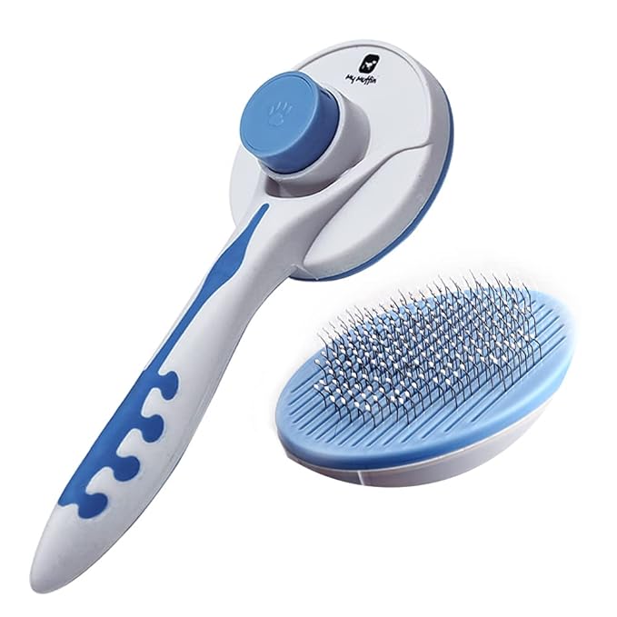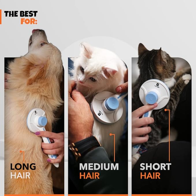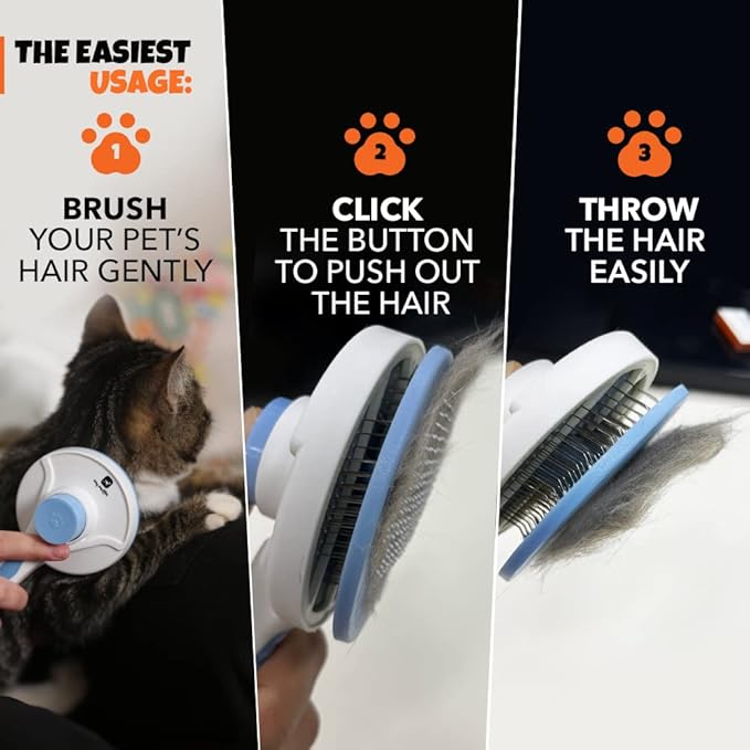 - Self Cleaning Hair Brush - Smart hair release mechanism, hair fall-off in one click, angled stainless steel bristles with plastic coating for sensitive skin, durable, keep your pet healthy