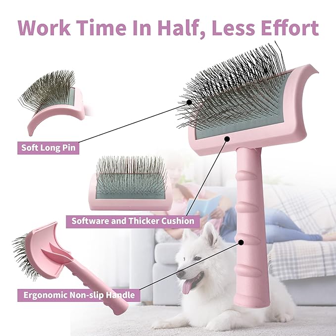 - LONG PINS and CUSHION PAD:NeatHoiho slicker brush has 50% longer, denser, and softer pins– each pin is approximately 1 inch long.Each pin is bent and angled at approximately 45 degrees, so it won’t scratch your dog’s skin. This dog slicker brush has a retractable cushion pad that protects your pet's skin from being scratched by the brush's pins