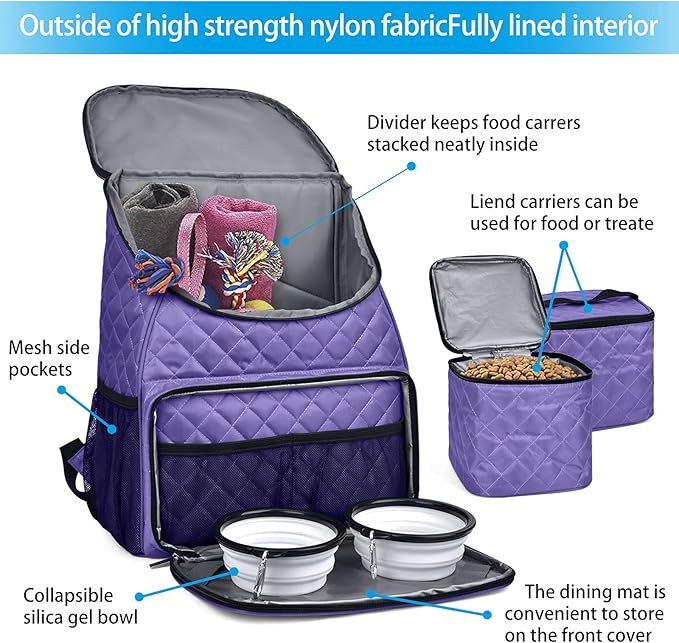 BAGLHER Dog Travel Bag Airline Approved Pet Supplies Backpack, Dog Travel Backpack with 2 Silicone Collapsible Bowls and 2 Food Baskets Purple