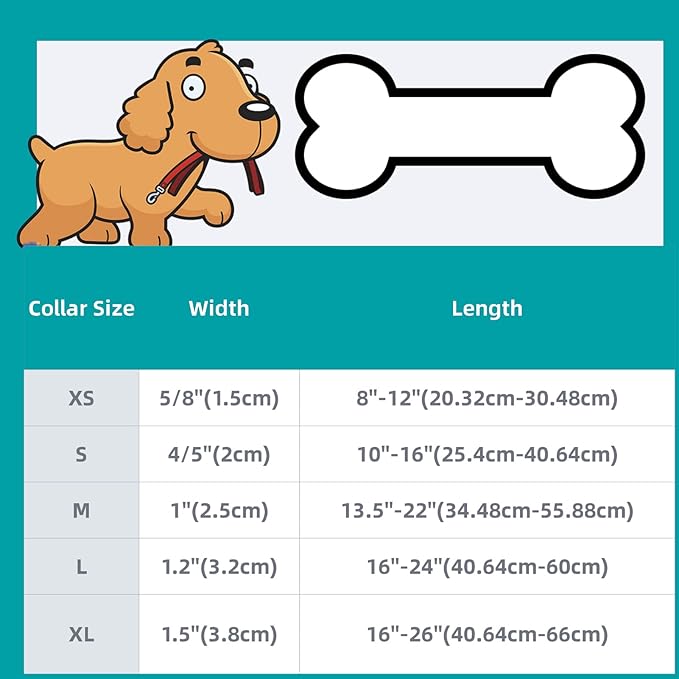• Durable Dog Collar Size: Adjustable dog collar for large dogs & dog collar for small dogs. Collar for dog size-XS(5/8"Wid*8"~12"Len), S(4/5"Wid*10"~16"Len), M(1"Wid*13.5"~22"Len), L(1.2"WId*16"~24"Len), XL(1.5"Wid*16"-26"Len)