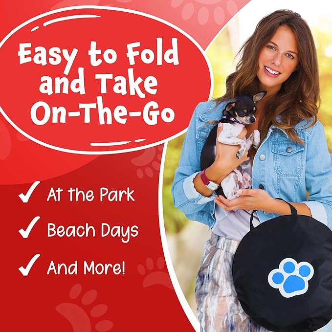 - Set Up in No Time — This mesh pet camping tent pops up from its compact folded circle and into shape in a matter of seconds. Fix it to the ground using the 4 included ground stakes to hold it in place. Fold it back up and take this lightweight portable pet enclosure to parks with its matching 16" black carrying bag