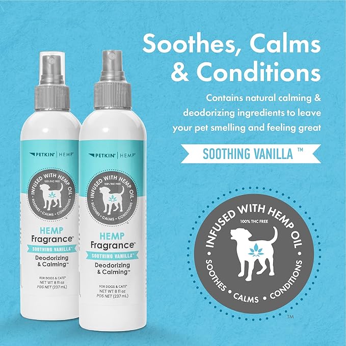- Petkin Cat and Dog Fragrance Spray - Our Hemp pet spray is a convenient way to keep your pet smelling and feeling great. We combine Hemp Oil and soothing vanilla extract to freshen, deodorize and calm. 1 spray bottle, 8 oz.
