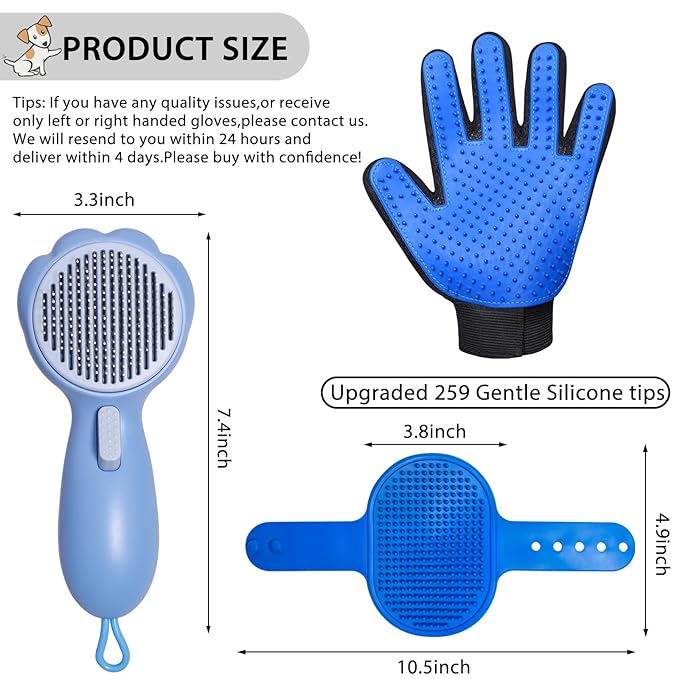 - Perfect Grooming Combination:1 pcs Dogs Cats Brush,1 pcs Dogs Cats Grooming Glove,1 pcs Dogs Cats Bath Brush;The grooming kit can be used short, medium and long, thick, thin and curly haired pets,let your pet’s coat soft and shiny