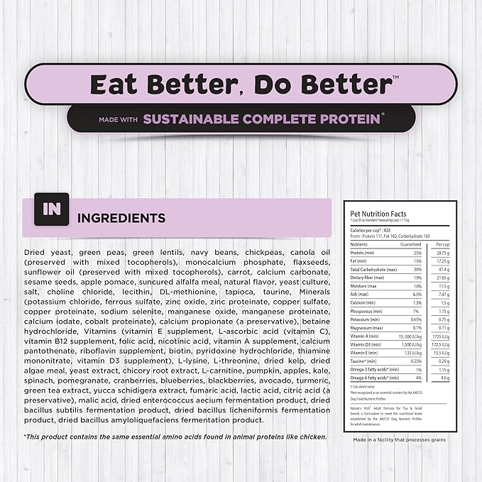 - SUSTAINABLE COMPLETE PROTEIN – Our primary source of protein is a plant-based, dry yeast that provides all essential amino acids and nutrients, similar to animal proteins found in chicken, making it a top choice for vegan dog food and dry dog food options. This eco-friendly protein emits significantly less CO2 than traditional meat sources, supporting a more sustainable, plant-based diet for dogs.