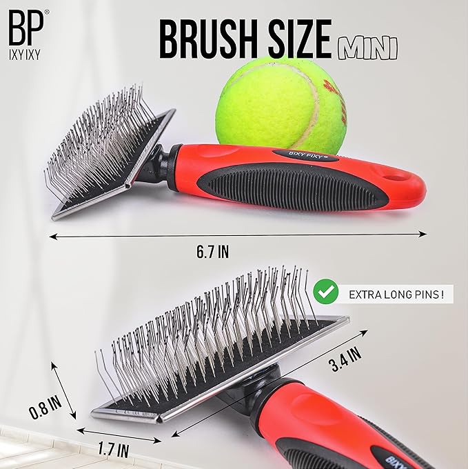 - 💚 EXTRA LONG PINS - Universal dog slicker brush provides a gentle and effective touch to remove loose hair, dirt, and even tougher tangles from your cat or dog coat without damaging their skin. Dog brush for poodles have fine hard wire bristle, designed on a flat soft cushion to help avoid excessive pressure during the brushing session. Bixy Pixy is simply a miracle Golden Doodle Brush for shedding curly hair.