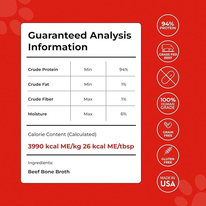 - Pure Protein Beef Broth for Dogs: 94-100% crude protein (vs others w/ 60-80%) made from grass fed beef marrow bones so your pet can thrive at any life stage. 2 TBSP of our bone broth for dogs powder mixed into hot water makes a dog beef broth.