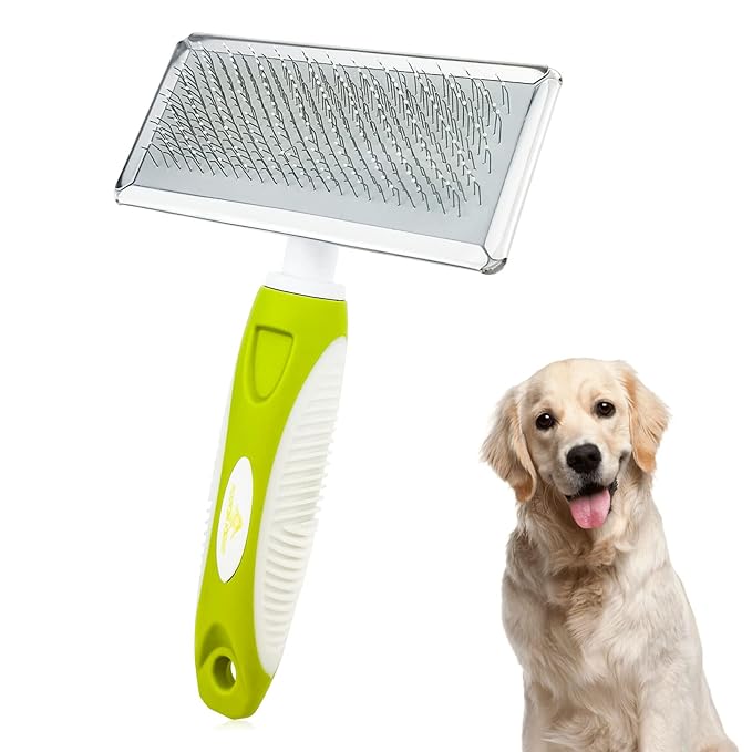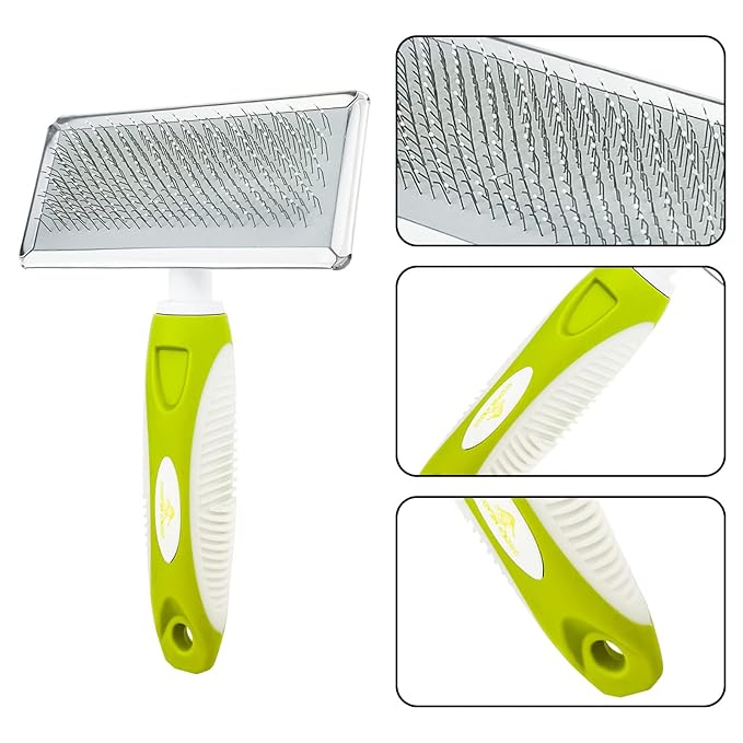 - 【ENJOY MASSAGE】- This dog slicker combs with stainless steel, and softer pins. This pet combs glides through thick coats without tugging or pulling hair, or scratching their skin, offering a relaxing massage. Our pet grooming pin combs reduces young & old dogs & cats' shedding. No worrying about unsightly hair or fur all over your house, beds, or car. Reducing coat issues with regular combsing of your furry companion will reduce the chance of reactions in your home.