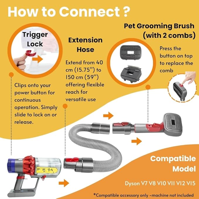 - 【Extension Hose】Up to 60 Inch,easily extend to reach more area. Save your time and make cleaning more convenient.【Switch】Fitted to the vacuum cleaner's button, it'll automatic boot,your hand free.When you use the pet brush, Slicker bristles positioned at 35 degree to protect pet form damage during hair cleaning process. After using the dyson groomer tool, the bristles retract for accidental scratch.