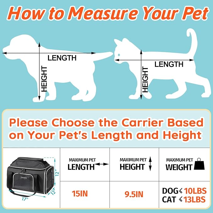 - 【CHECK SIZE BEFORE BUYING】In order to fit the under-seat dimensions of airlines, this carrier can only fit small dogs and cats. We recommend that the pet size you carry be within 15"L x 10"W x 9.5"H and weight under 10LBS. Please don't choose the carrier only based on weight but also reference your pet's length and height.