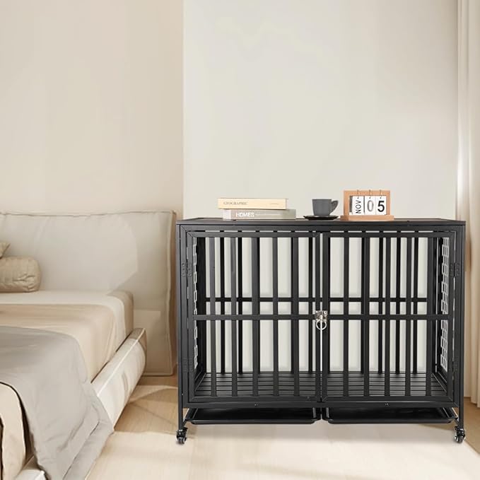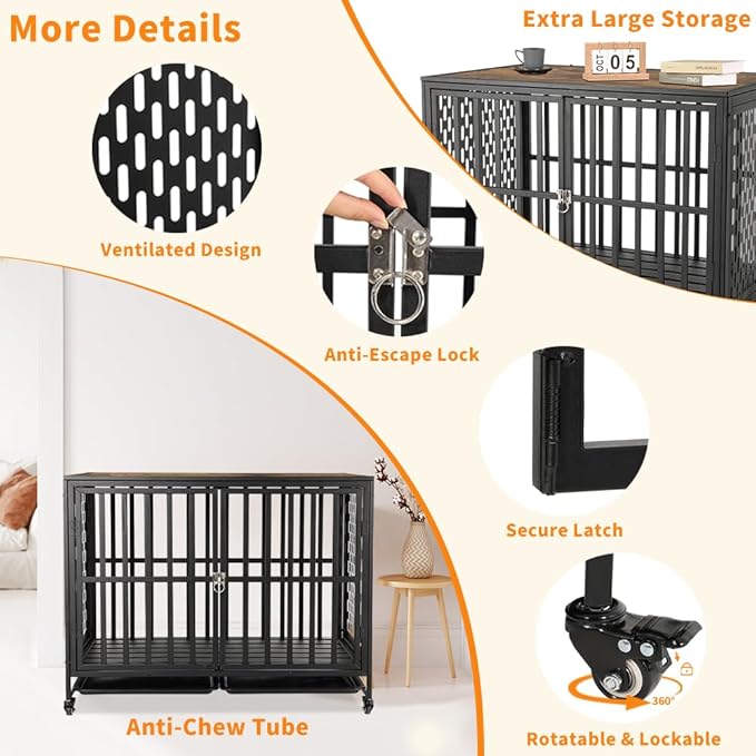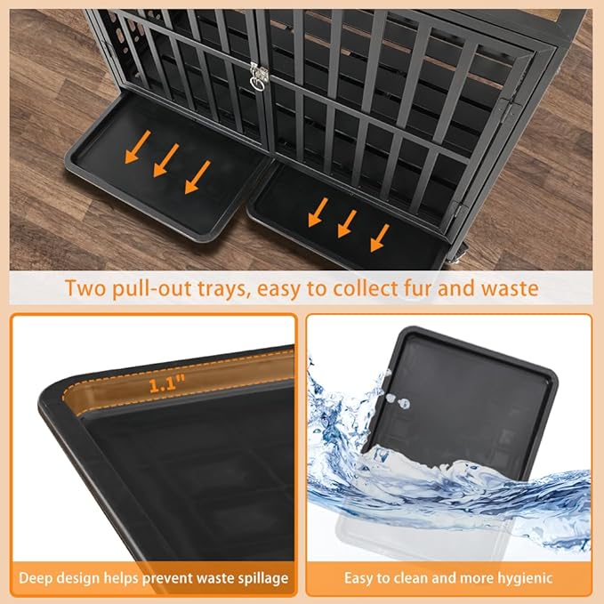 - Easy to Maintain and Move: The dog kennel indoor comes with 2 pull-out trays to collect dirt, washable and easy to clean. The front door makes it easy for pets to get in and out. The large dog crate equipped with 4 lockable 360-degree rotating wheels that allow you to easily move