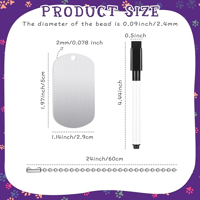 - Strong Material: dog tags necklace is made of aluminum material, with strong structure and smooth surface, reliable to use; Stainless steel chain is not easy to rust or break, can be stored for a long time;The equipped marker pen allows you to write something on the dog tag, and the writing is erasable