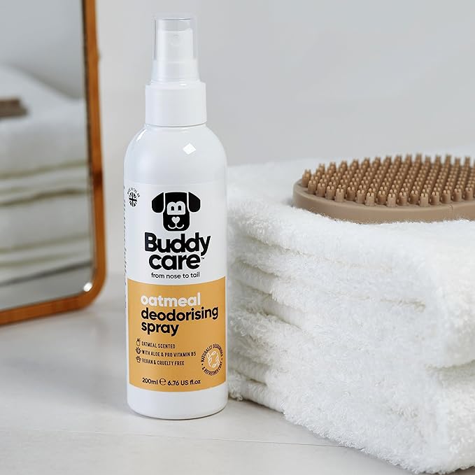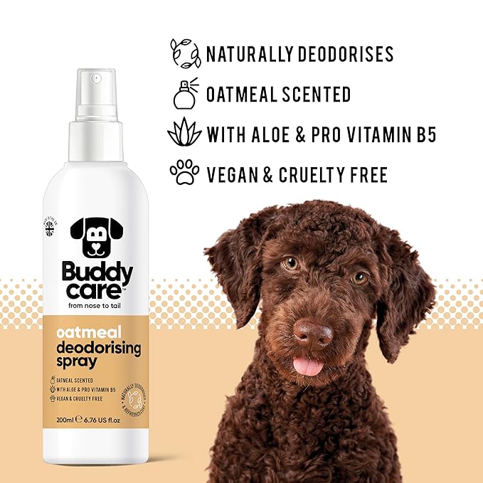 - OATMEAL DOGGY DEODORISING SPRAY - Freshen up Fido with this oatmeal fragranced deodorising spray that helps eliminate doggy odours. No more stinky pooch, just a soothing sweet scent wherever they go!