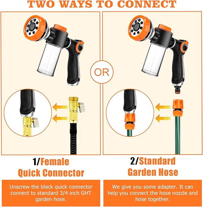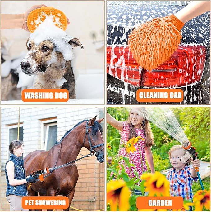 - 8 Spray Patterns: The dog wash foam sprayer has 8 types of nozzles, rotate click spray selector for different settings ( rinse, stream, flat, center, jet, shower, mist, and cone ), whether you need wash your car, or the gentle shower to wash your pet, the 8 patterns have you all covered. which can bathe your pets, water lawns, plants, gardens, wash your car, spray nozzle for garden hose fit your different needs.