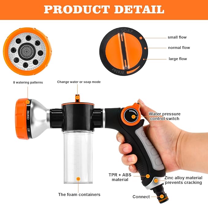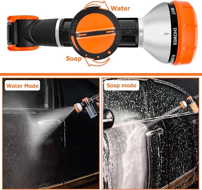- Ergonomic Design: Easily thumbwheel switch, it only needs a slight push by the thumb to start work and adjust the water output. The soap on/off would help you to switch the soap mode and water mode, and control the dilution of foam; Rotate the head of hose sprinkle, and switch the water spray mode.