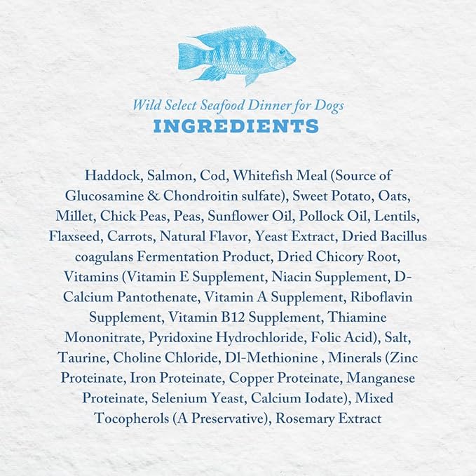 - WILD SELECT SEAFOOD FORMULA: Made with a blend of real wild caught Haddock, Salmon, Cod, and Whitefish. This food is made with no chicken or other animal by-products. Fish formula also prevents chicken and beef allergies