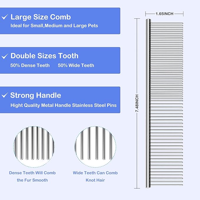 - STAINLESS STEEL COMB 2-IN-1 DESIGN - Sparse teeth to loosen tangled hair & comb large fluffy hair, also can be styled for dogs; dense teeth to comb eyes ears, nose & fine hair on legs; rounded pins with smooth stainless steel to effectively prevent static electricity & tangled hair when combing.