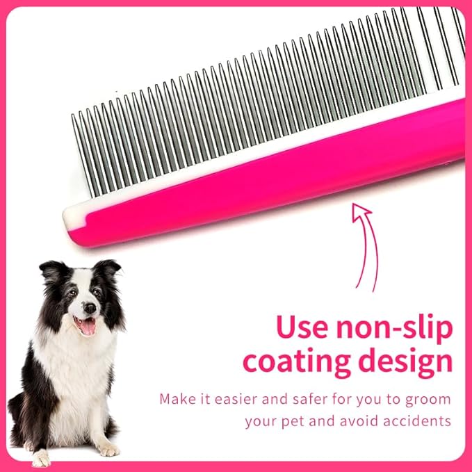 - STAINLESS STEEL COMB: The dog steel comb comes with 2 densities both with rounded teeth for gente and convenient combing of different parts of your pet’s body. Use the wide spaced teeth to combe large areas or combing knotted fur and the close teeth for combing or brushing fur around your pet’s eyes, ears or fine hair on their legs. Suitable for long and short haired cats, dogs of rabbits!