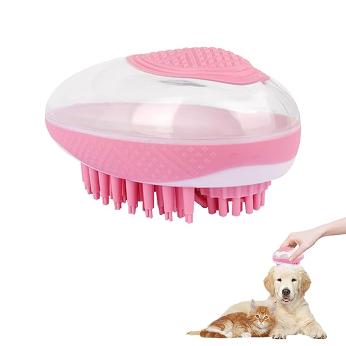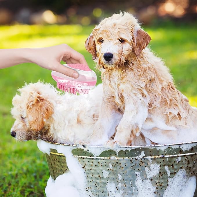 WishLotus Pet Bath Brush, Puppy Massage Brush with Shampoo Dispenser Pet Grooming Tool for Small Animals Soft Silicone Dog Shower Brush for Long Short Haired Dog and Cat Washing (Pink)