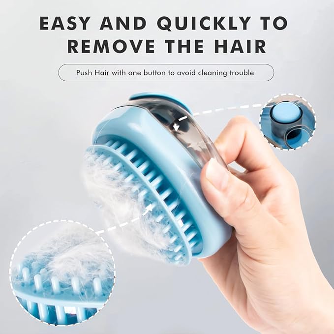 - 【New Design】The side of this dog bath brush scrubber has an anti-slip design which can offering a comfortable grasp when bathing your pet. At the top of the bottom, you can open the small cover and pour shampoo and water. When in use, you can press the top silicone button to dispense blisters to your pet‘s fur coat. then gently remove loose hair, dust and dirt. After finishing bathing, just gently press the one-click cleaning button to easily clean the hair on the brush.