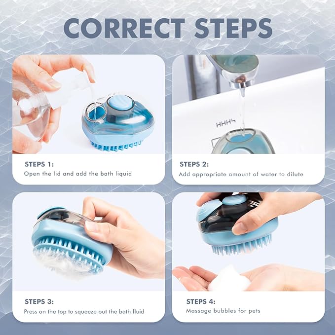 - 【Bubble Maker】Our dog scrubber for bath with one-piece foam reservoir design can help you save a lot of time squeezing and diluting shower gel. it can be refilled with shampoo, dilute the pet shampoo beforehand, then press the top to dispense blisters to your pet‘s fur coat while taking a shower, which can achieve the effect of saving shampoo and create rich foam.