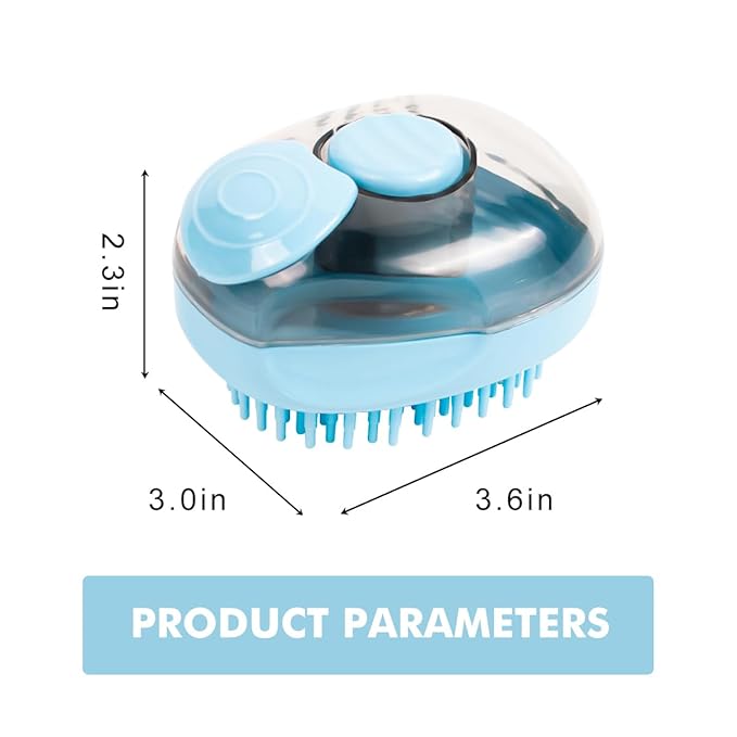 - 【New Design】The side of this dog bath brush scrubber has an anti-slip design which can offering a comfortable grasp when bathing your pet. At the top of the bottom, you can open the small cover and pour shampoo and water. When in use, you can press the top silicone button to dispense blisters to your pet‘s fur coat. then gently remove loose hair, dust and dirt. After finishing bathing, just gently press the one-click cleaning button to easily clean the hair on the brush.