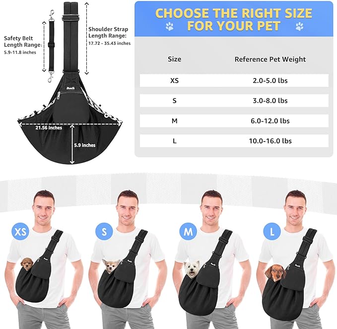 Lukovee Pet Sling, Hand Free Dog Sling Carrier Adjustable Padded Strap Tote Bag, Shoulder Bag with Front Pocket Safety Belt Carrying Small Dog Cat Puppy Machine Washable (Black-WY,S)