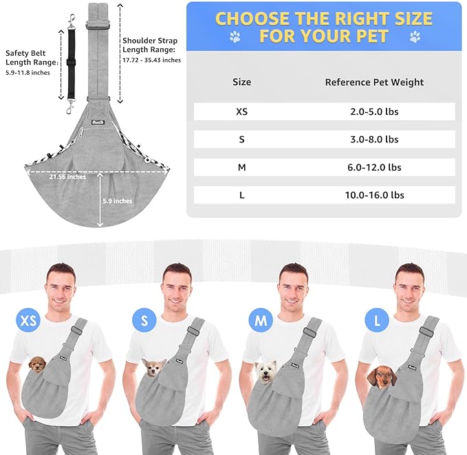 Lukovee Pet Sling, Hand Free Dog Sling Carrier Adjustable Padded Strap Tote Bag, Shoulder Bag with Safety Belt & Front Pocket for Small Dog Cat Puppy (Grey-WY,L)