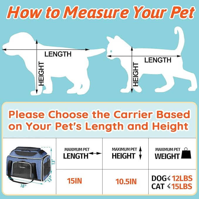 - 【CHECK SIZE BEFORE BUYING】In order to fit the under-seat dimensions of airlines, this carrier can only fit small dogs and cats. We recommend that the pet size you carry be within 15"L x 11"W x 10.5"H and weight under 12LBS. Please don't choose the carrier only based on weight but also reference your pet's length and height.