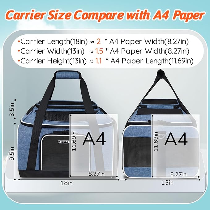 - 【AIRLINE APPROVED CARRIER 】Unfolded size:18"L×13"W×(9.5+3.5)"H, Petskd pet carrier is TSA approved and can be placed under the seat in the cabin, it is mainly designed for ①Southwest Airlines:18.5x13.5x9.5"②Allegiant Airlines:19x16x9", but also in compliance with ③Air Canada:21.5x15.5x10.5". We recommend you buy this carrier when you fly with the above-mentioned airlines.