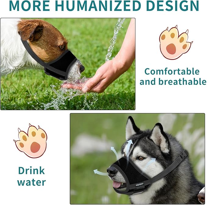 - UPGRADE HUMANIZED DESIGN - Different from the traditional dog muzzle, wearing the dog mouth cover, you can leave a proper space for your dog mouth to breathe, gasp and drink. The more humane design solves the inconvenience of traditional dog masks that do not drink water.