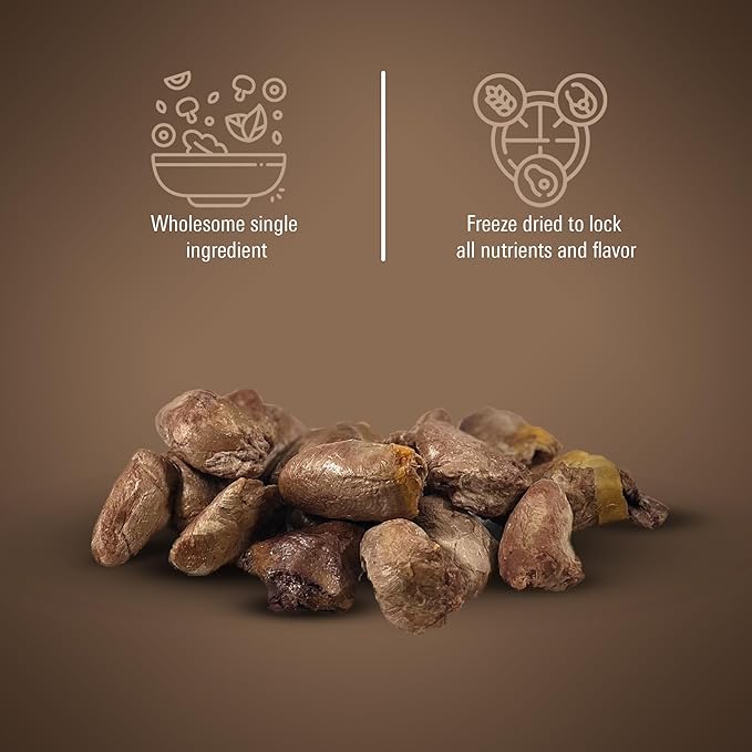 - **Nutritious & Single Ingredient (Dogs & Cats) **Give your pets the purest delight with these single ingredient dog treats, made from freeze dried chicken hearts. Perfect for dogs of all stages, and safe for curious cats, each bite retains its raw flavor and nutrients for wholesome snacking.