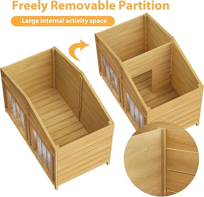 - 【Great Dog House For The Money】Our wooden dog house has the partition function, equipped with flexible and removable partitions, and the middle of the partitions can also be shuttled at will, creating different functional areas for the puppy's home. If your dog is bigger, the divider can also be removed to give your dog a large space to move around.