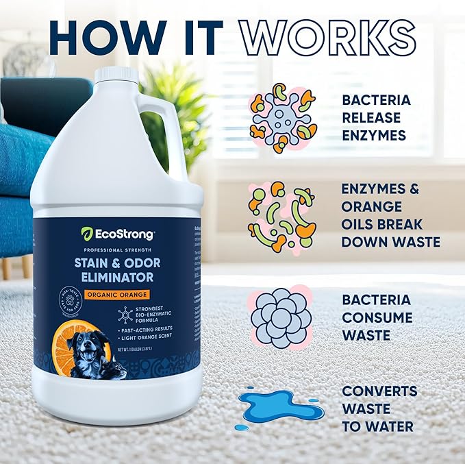 - Proudly Made In the USA: Organic Orange Stain & Odor Eliminator is a unique combination of orange oils, natural detergents, odor counteractants, and our proven bio-enzymatic formulation.