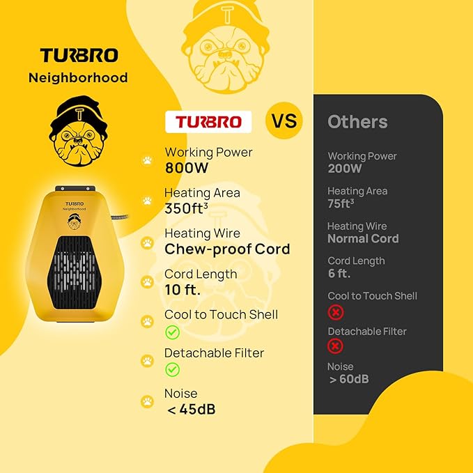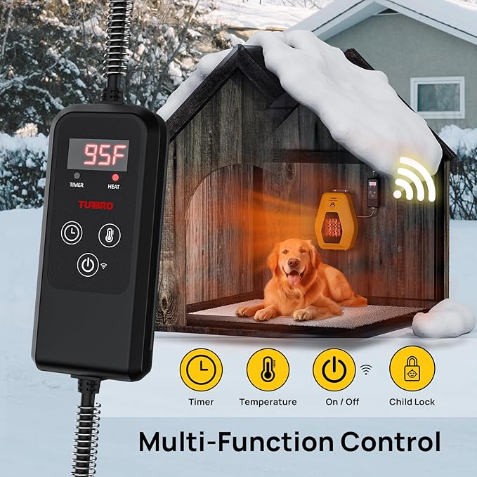 - Smartphone Control: Upgrade your dog house heating experience with TURBRO WiFi-enabled heater. Use the AIR.ai app on your smartphone to monitor the heater's temperature, set timers, and adjust the temperature remotely. Plus, enjoy peace of mind with the built-in child lock feature, preventing accidental changes by kids. Enhance convenience and your pet's comfort! [Note:WiFi function only works with 2.4G network]