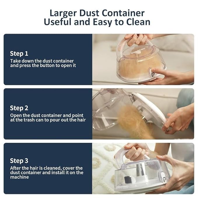 - NOT EASILY CLOGGED: The pet hair vacuum grooming brush adopts a vertical air inlet and a conical 360 degree air inlet metal mesh design, the filter screen will not be clogged, and there is an extended detachable hose. If clogged, the detachable hose can be unblocked, and easy operate with one click to open the cover.