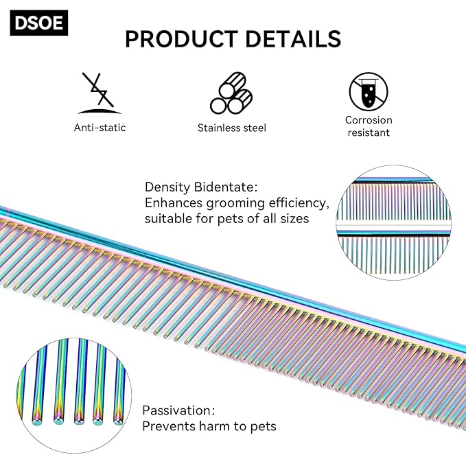 - HIGH QUALITY MATERIAL: Metal dog comb is made of high quality stainless steel, well polished, corrosion resistant and durable. With advanced coating process to ensure that the color will not fade and can effectively prevent static electricity, it is a reliable grooming tool worthy of long-term use