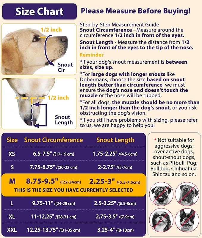 - Dog Muzzle Medium Sized Dogs-Size M is suitable for snout circumference between 8¾"-9½", and snout length longer than 2¼". The dog muzzles for medium dogs are suitable for Border Collies and Whippets. Please measures twice before buying. If you have any problems with our muzzle for medium sized dog, we will do our best to help you.