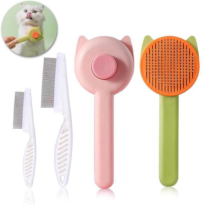 Pet Grooming Brush Kit for Cat and Dog, Hair Massage Cleaner with Release Button, 2 Flea Combs for Shedding Removing Tangles Loose Fur Self Cleaning Accessories (4 Pieces Set)