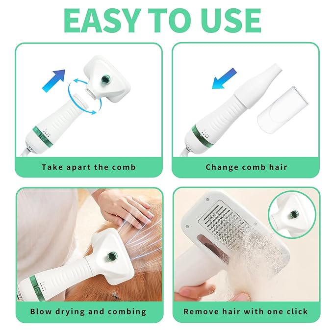 - 2-in-1 pet grooming dryer: 2-in-1 design with pet hair dryer and pet comb, which can meet the needs of pethair drying and grooming at the same time, and save time and effort.