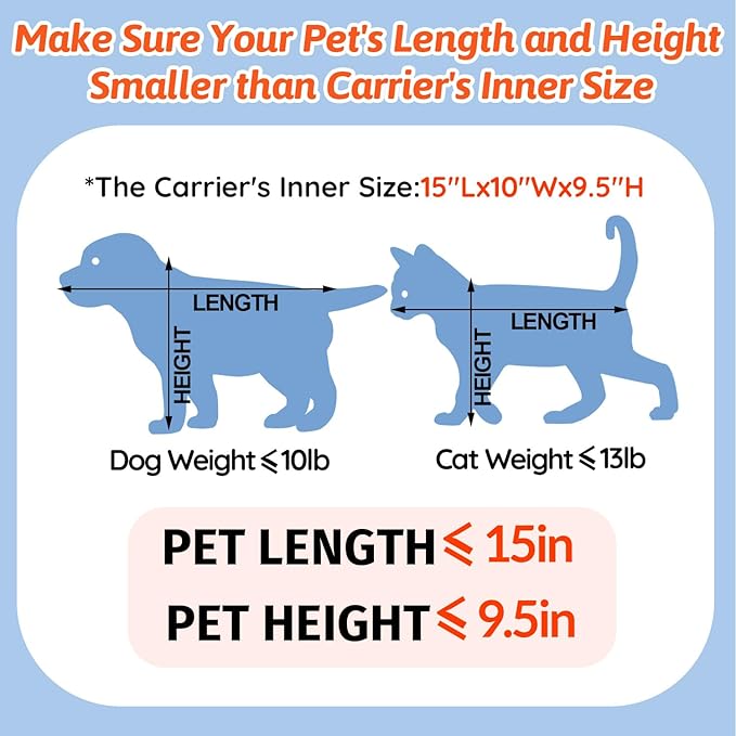 - 【CHECK SIZE BEFORE BUYING】In order to fit the under-seat dimensions of airlines, this carrier can only fit small dogs and cats. We recommend that the pet size you carry be within 15"L x 10"W x 9.5"H and the DOG max weight is 10LB, CAT max weight is 13LB. Please don't choose the carrier only based on weight but also reference your pet's length and height.