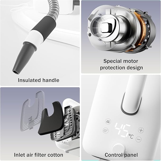 - Adjustable Temperature with Safety Control: This dog hair dryer has a built-in heater, the button (+ -) can conveniently adjust the temperature to 104-140℉/40-60℃. Heating control protection system, if the temperature is too high, it will stop heating immediately to avoid any danger.