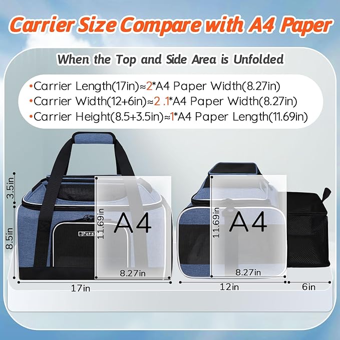 - 【AIRLINE APPROVED CARRIER 】Unfolded size:17"L×(12+5)"W×(8.5+3.5)"H, Petskd pet carrier is TSA approved and can be placed under the seat in the cabin, it is mainly designed for ①JetBlue Airlines:17x12.5x8.5"②Spirit Airlines:18x14x9"③Frontier Airlines:18x14x8", but also in compliance with ④Allegiant Airlines:19x16x9"⑤Southwest Airlines:18.5x13.5x9.5"⑥Air Canada:21.5x15.5x10.5". We recommend you buy this carrier when you fly with the above-mentioned airlines. When you take the carrier on airplane, please fold the top and side expansion areas for the size of airline seat.